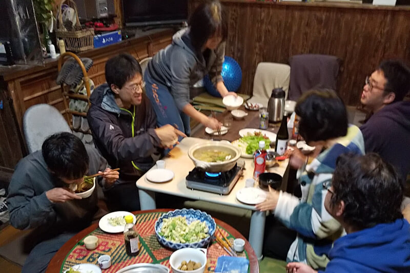 近くに住む元住人さんも、たまたま来ていた遠方で暮らす元住人さんも、それぞれが一品ずつ持ち寄って、みんなでいただきます。一品つくっただけなのに、こんなにも華やかになる食卓は、いいものです。